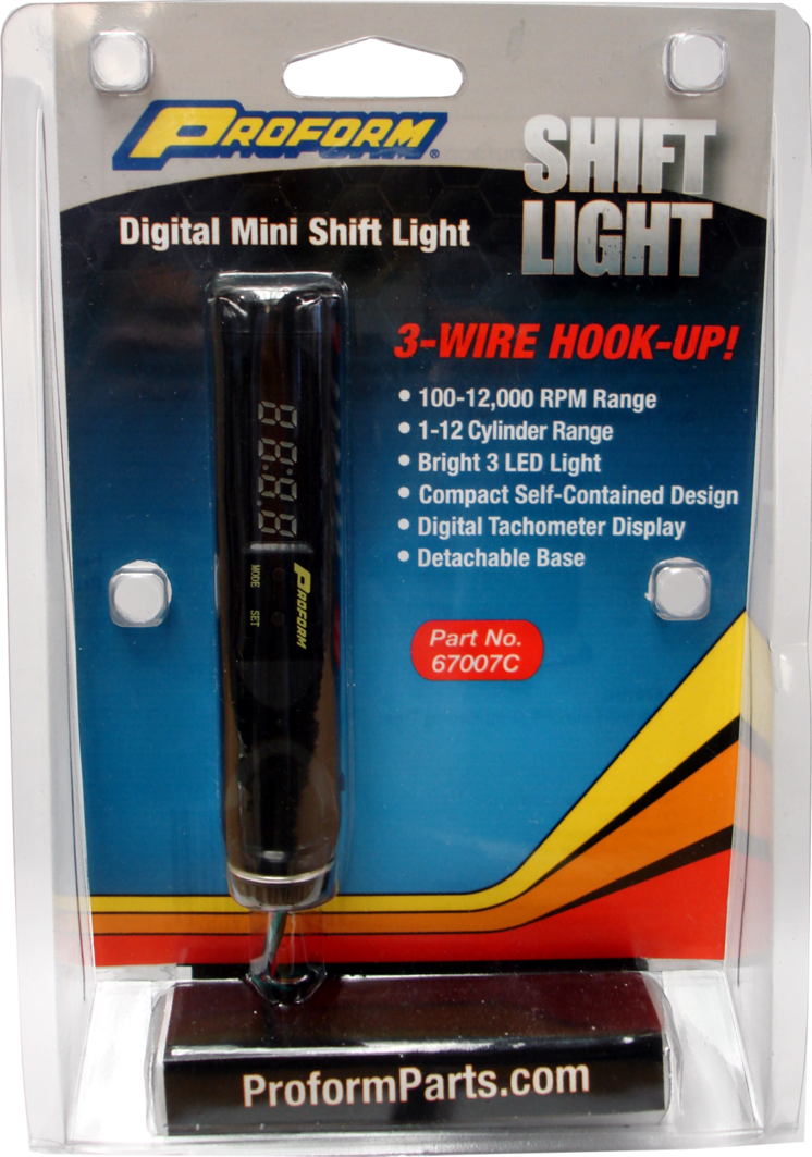 Easy to set digital shift light will help you leave your competitor eating exhaust at the track! The new Proform Mini Digital Shift Light and Diagnostic Tachometer can be easily installed in vehicles with 1-12 cylinders. Measuring at only 4-1/4 inches long, this 3 LED light will give you the signal when it is time to shift! All settings are easily controlled with two buttons. Features include a 100-12,000 RPM range in 100 RPM increments, Cylinder range of 1 thru 12, Adjustable brightness for the digital display, and a display on/off feature when in use. Also, when you are in the garage tuning your ride, you can easily detach the shift light from its mount and place it on your dashboard so the tachometer digital display is facing out...so you can see it while you're tuning. Imagine that...no more yelling into the house to get somebody to tell you when your engine is at 3000 RPM! Simple, Innovative, Affordable...that's PROFORM! Sold individually.