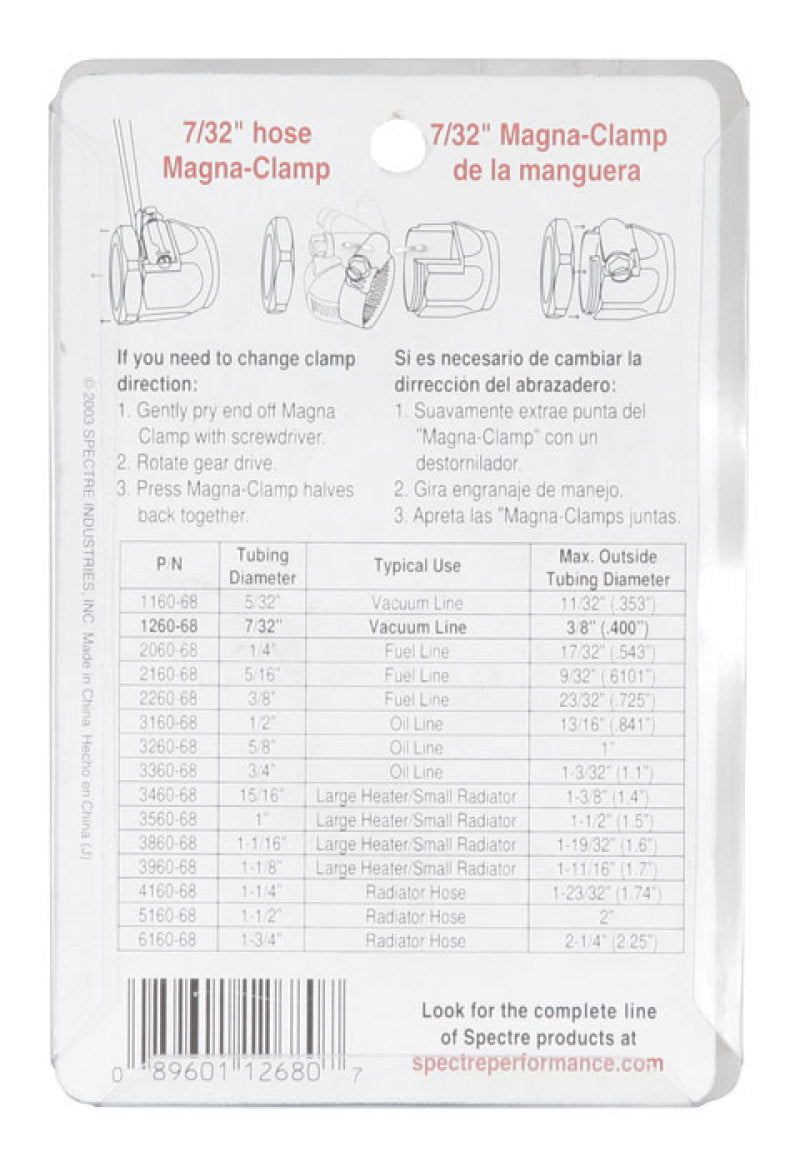 Spectre Magna-Clamps 1268 are designed to fit 7/32 inch inside diameter vacuum hoses that have a maximum outside diameter of 0.400 inches including any covering. Included are 2 push-on clamps that feature a two-piece chrome-plated anodized aluminum housing that provides secure tightening at an affordable price. Magna-Clamps are designed to perform as well as they look and are ideal for race, street and show.