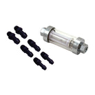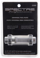 Spectre's premium Clearview fuel filter kit is a universal fuel filter that can be used with 1/4 inch to 1/8 inch fuel line. This kit includes a set of 1/4 inch, 5/16 inch and 3/8 inch barb fittings. This inline clear view fuel filter features a glass body for clear, quick viewing of any debris trapped in the white mesh. The inner white mesh filter is replaceable, saving time and money. This kit was designed for non-fuel injected applications and it is easy to install with no special tools or skills required.